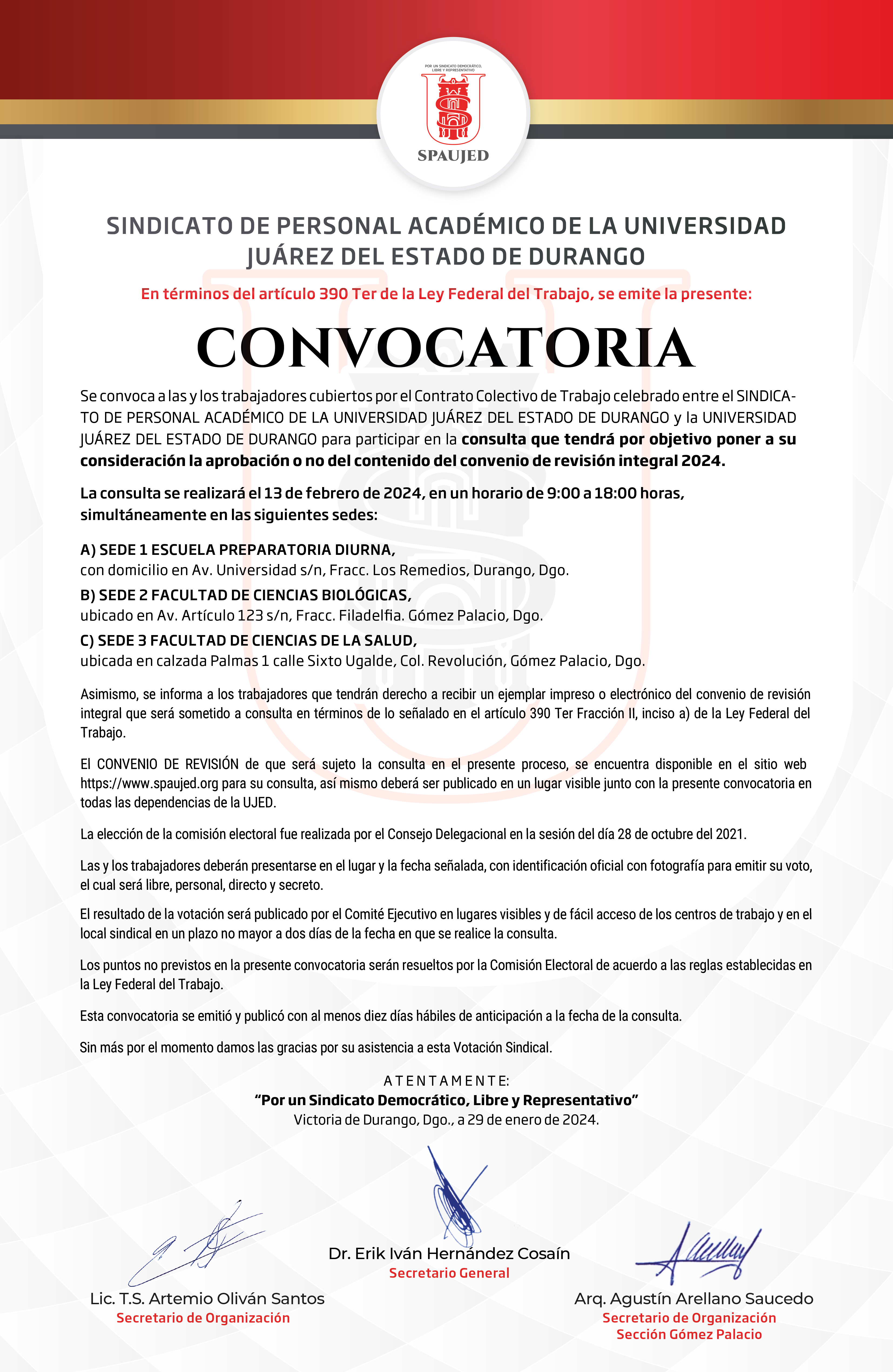 El próximo 13 de febrero será sometido a consulta el Convenio de Revisión Integral 2024. Esperamos contar con tu participación activa en este ejercicio democrático del SPAUJED. Te compartimos el enlace para revisar el documento.
