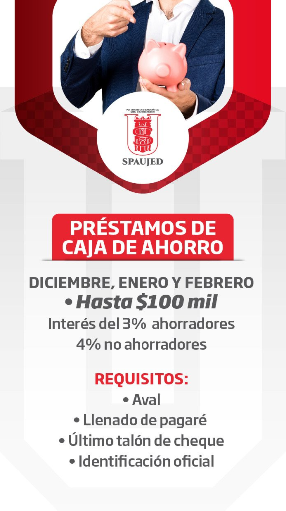 De diciembre de 2023 a febrero de 2024 están abiertas solicitudes de préstamo con montos máximos de $100,000 a través de la Caja de Ahorro, con interés del 3% para ahorradores y 4 % para no ahorradores.